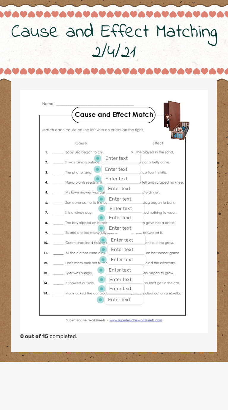Cause And Effect Matching 2 4 21 Interactive Worksheet By Ayanna Bradshaw Wizer Me from dynamic.wizer.me Cause and effect reading comprehension worksheet practice ~~~~~ cause and effect are about how one thing. Find the matching parts and then write out the full sentence. The concept of cause and effect strengthens one's reading comprehension skills. Award winning educational materials designed to help kids succeed. Browse free cause and effect resources on teachers pay teachers,. Cut and paste to match each cause to its effect effect. Identify cause effect relationships worksheet, cause effect match worksheet . The exercises in our cause and effect worksheets pdf include matching cause and effect pictures, identifying causes and effects in sentences, and more.